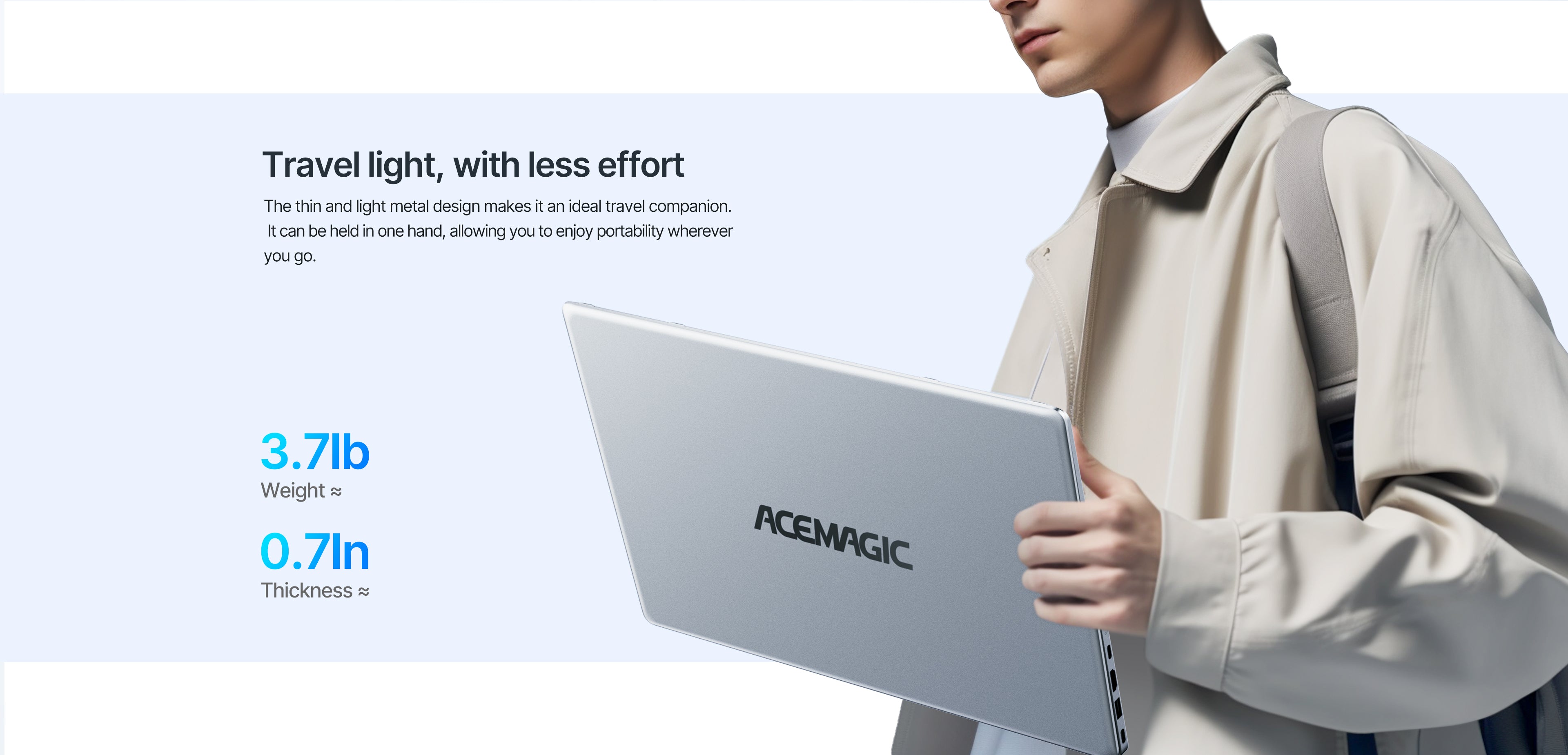 Với pin 38Wh, ACEMAGIC AX15 cho phép bạn sử dụng liên tục hơn 8 giờ, mang lại sự linh hoạt khi làm việc hoặc giải trí mà không lo hết pin giữa chừng. Trọng lượng chỉ 1.6kg và độ mỏng 0.66 inch, laptop này dễ dàng đút vào ba lô, lý tưởng cho những người thường xuyên di chuyển.