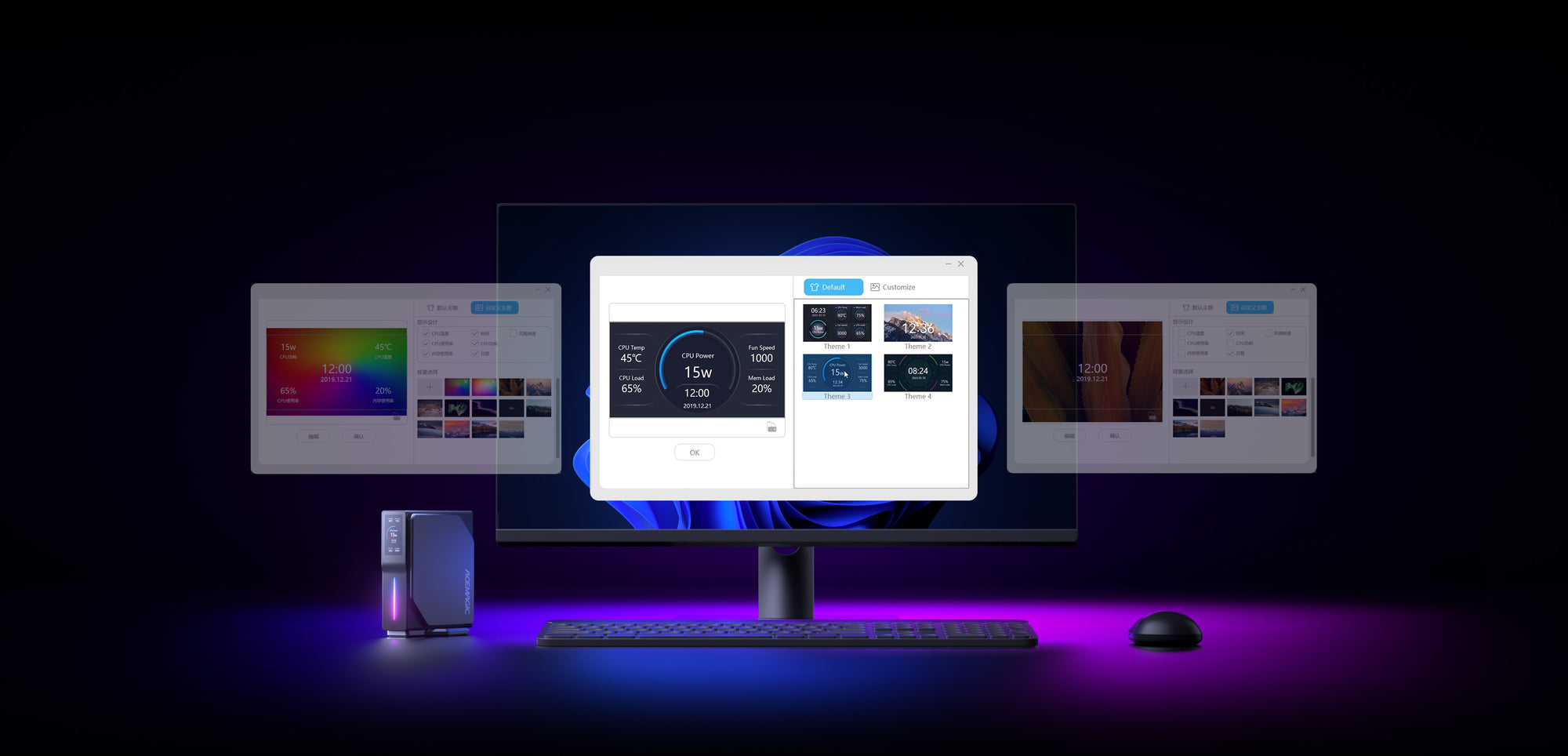 Màn hình TFT LCD 1.9″ với độ phân giải 170*320 trên ACEMAGIC S1 Mini-PC cung cấp thông tin quan trọng về hoạt động của CPU, bao gồm các cài đặt TDP, mức độ tiếng ồn của quạt và tải CPU. Ngoài ra, người dùng có thể cá nhân hóa màn hình bằng cách chọn các chủ đề từ thư viện có sẵn thông qua phần mềm đi kèm.