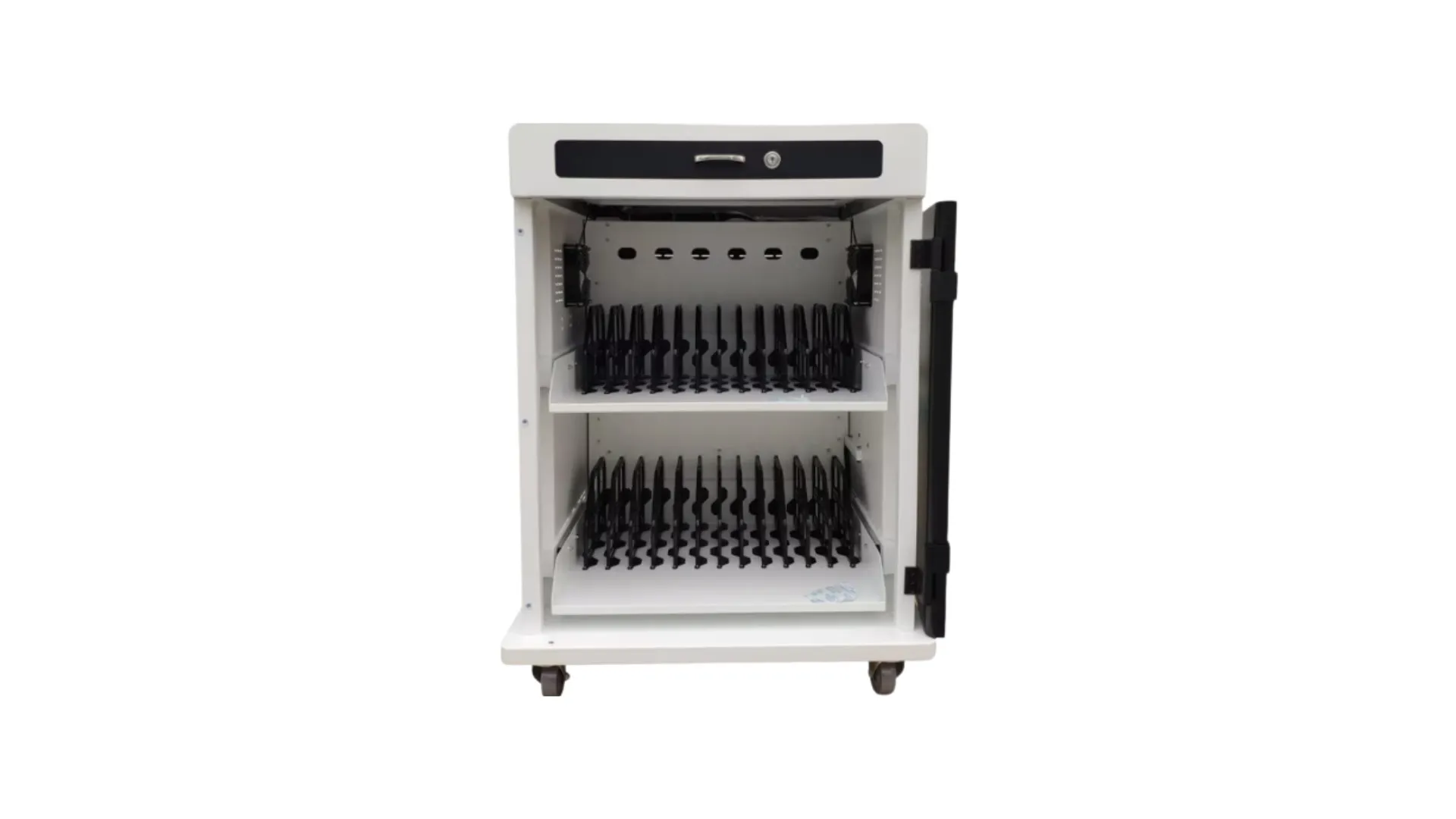 Tủ sạc được trang bị bánh xe chống trầy 3–4 inch kèm khóa phanh, dễ dàng di chuyển nhưng vẫn cố định chắc chắn khi cần. Hệ thống quản lý cáp thông minh giúp không gian bên trong gọn gàng, tránh rối dây, đồng thời hỗ trợ cả ổ điện tiêu chuẩn và cổng USB tùy chọn, mang lại sự linh hoạt tối đa trong quá trình sử dụng.